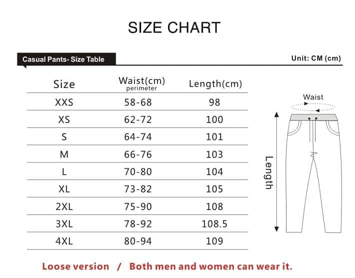 | Pants Small Sizes | XS, S, M, L, XL, 2XL, 3XL, 4XL |